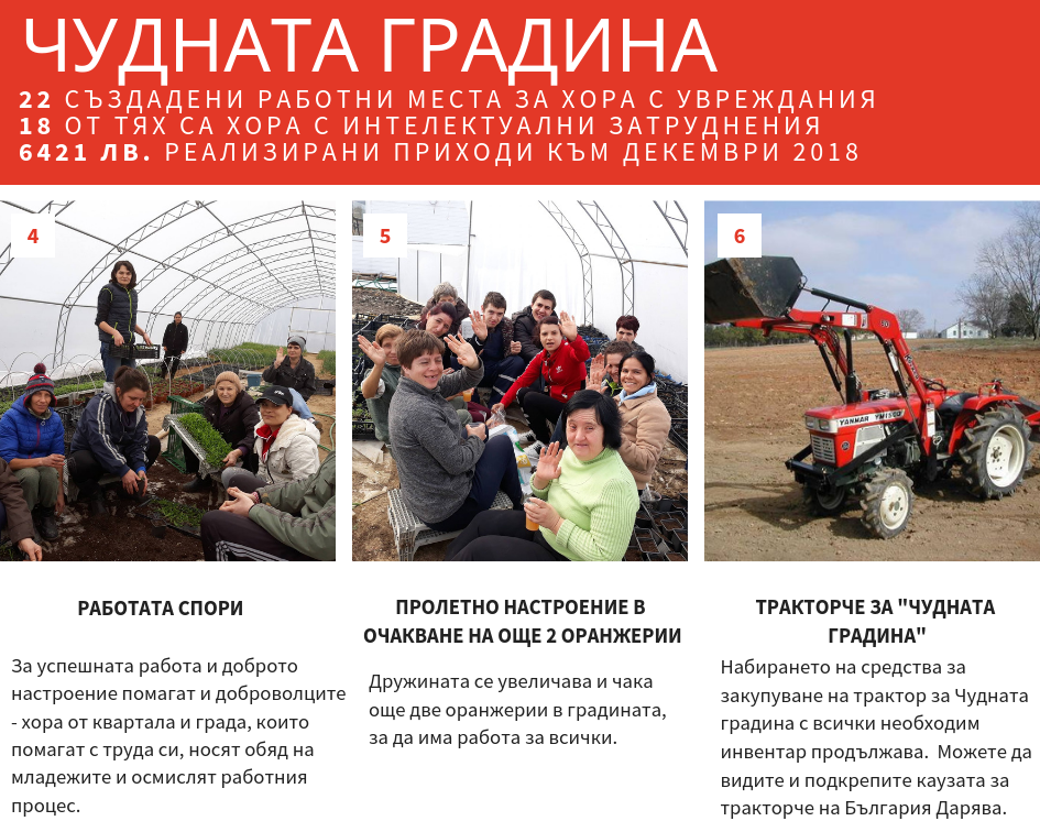 Идеята, с която фондация „Свети Николай Чудотворец" от Добрич спечели симпатиите на журито на програмата през март миналата година беше изграждането на оранжерия за производство на разсад, която да осигурява подходящи условия на труд за хората с интелектуални затруднения. Освен журито, идеята за чудна градина се оказа най-харесвана и от служителите на УниКредит Булбанк. Като дългогодишен партньор на програмата на БЦНП, банката допълнително подкрепя някои от финалистите с парична награда. Кой от проектите да получи тази награда решават служителите в банката, които гласуват онлайн.