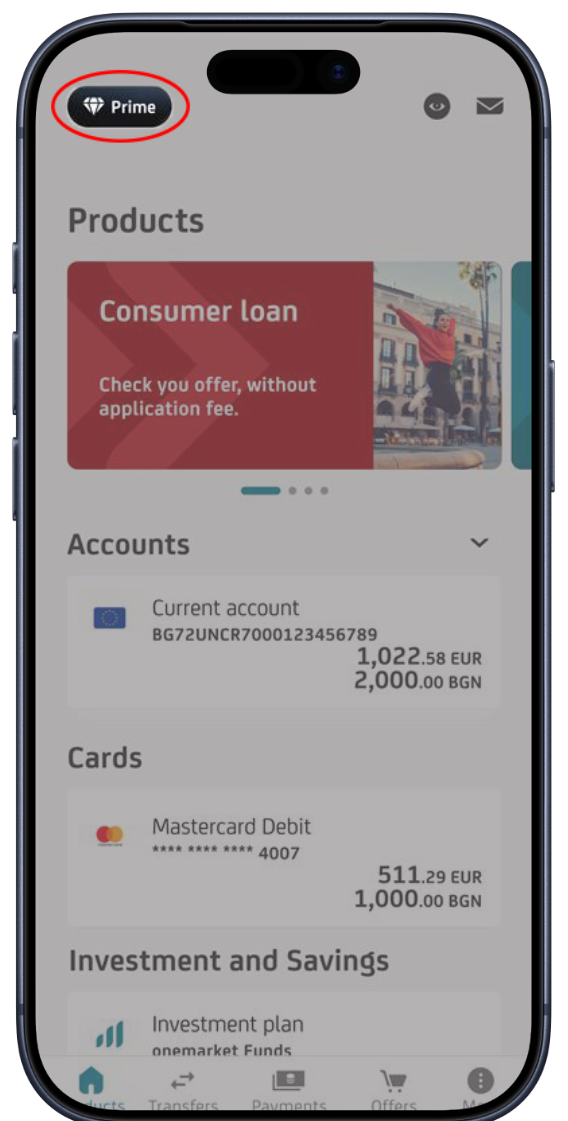 Всички Prime клиенти виждат логото на Prime на екрана след вход в Булбанк Мобайл. Ако не го виждате, можете да се свържете с Център за контакт с клиенти на телефон 1 84 84 или да подадете онлайн заявка ТУК, за да получите повече информация как можете да станете Prime клиент.